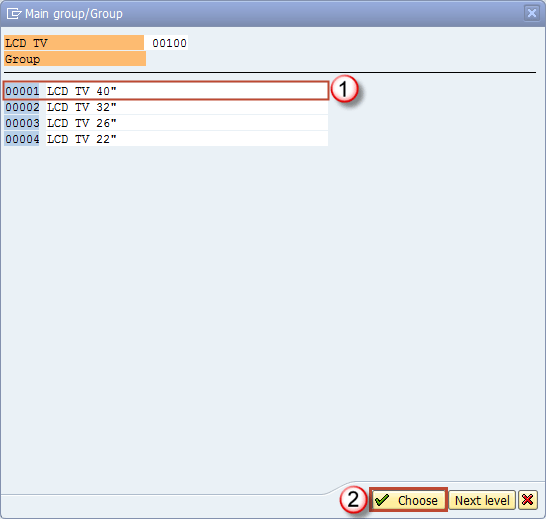 选择合适的第一个层级后,您应该像在上面的屏幕中一样单击“下一级”按钮。您将进入显示第二个层级可能条目的屏幕。正如您在此屏幕的标题中所见,这里有一个指示,表明此第二个层级是针对第一个层级 00100 – LCD TV 的。