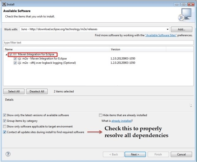 对于本教程,我们将使用 Eclipse (Juno) IDE for Java 开发人员来设置 Selenium WebDriver 项目。此外,我们需要将 m2eclipse 插件添加到 Eclipse,以促进构建过程并创建 pom.xml 文件。