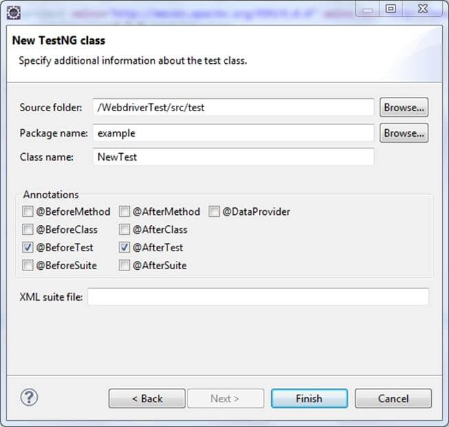 步骤 9) 创建一个新的 TestNG 类。在 Name: 文本框中输入包名“example”和“NewTest”,然后单击 Finish 按钮,如下图所示