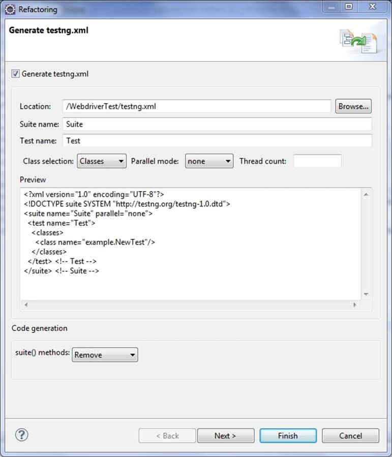 Eclipse 将创建 testng.xml,它表明您只需要运行一个名为 NewTest 的测试,如下图所示