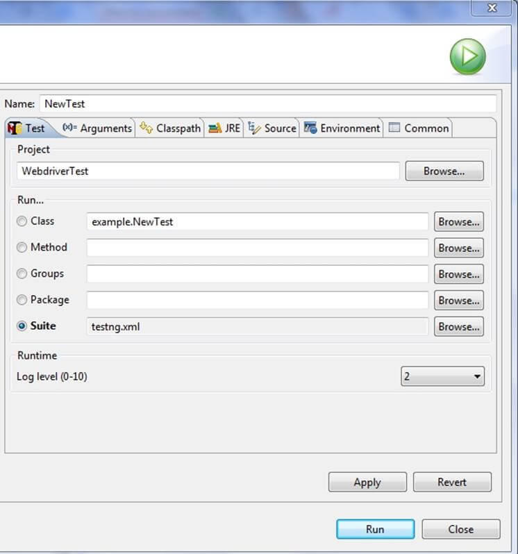因此,转到 Run Configurations 并创建一个新的启动 TestNG,选择项目并将 Suite 字段设置为 testng.xml,然后单击 Run