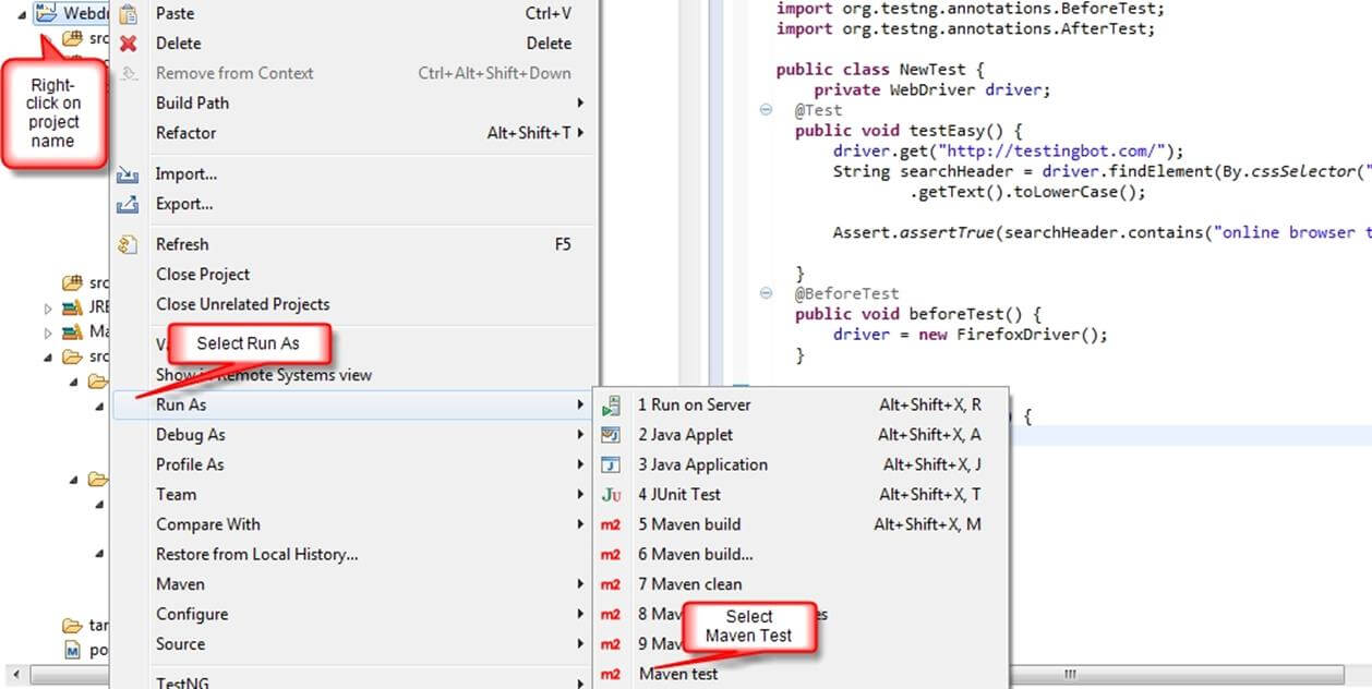 步骤 15) 要在 Maven 生命周期中运行测试,右键单击 WebdriverTest 并选择 Run As | Maven test。Maven 将从项目中执行测试。
