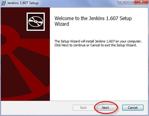 步骤 3) 在 Jenkins 1.607 Setup 窗口中单击 Next 按钮。