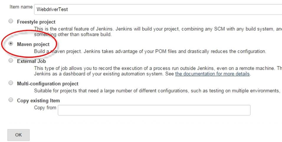 步骤 8) 单击 OK 按钮。在 Jenkins 仪表板中创建了一个名为“WebdriverTest”的新作业。