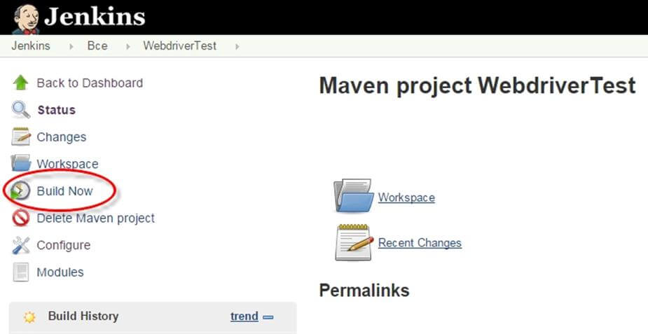 步骤 12) 在 WebdriverTest 项目页面上,单击 Build Now 链接。
