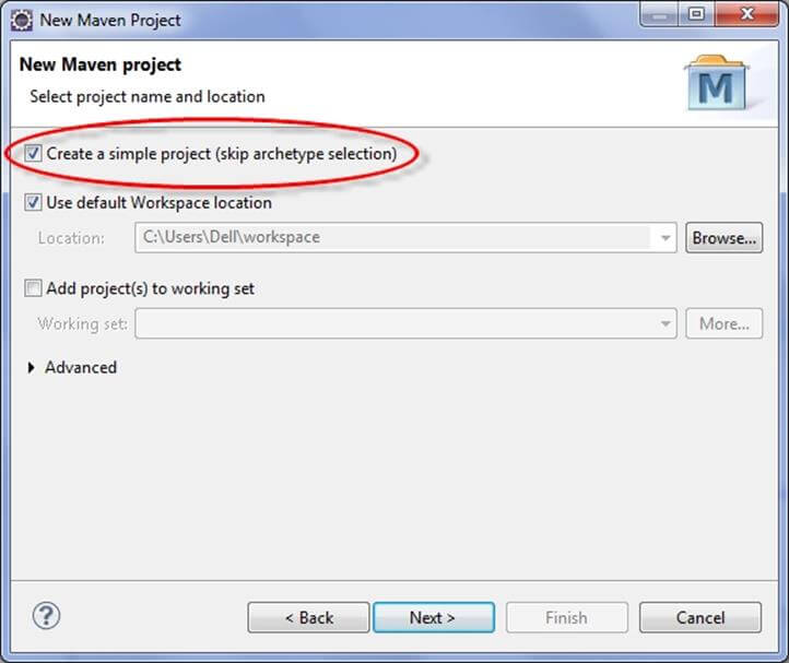 步骤 3) 在 New Maven Project 对话框中,选择 Create a simple project,然后单击 Next