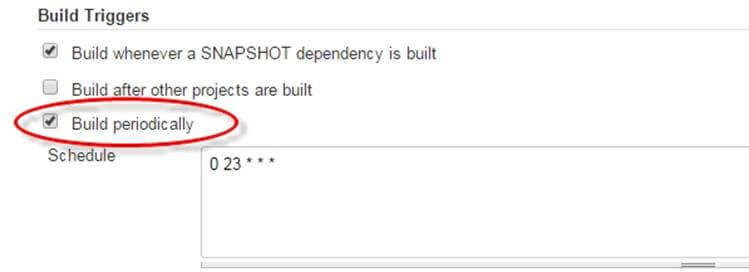 在 Schedule 文本框中输入 0 23 * * *,如下图所示。这将每天晚上 11 点触发构建过程。