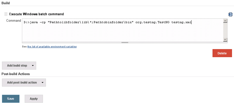 要在 Jenkins 中运行纯 TestNg 脚本,请在构建中输入以下内容