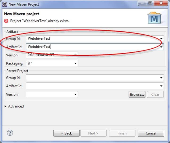 步骤 4) 在 Group Id: 和 Artifact Id: 中输入 WebdriverTest,然后单击 finish