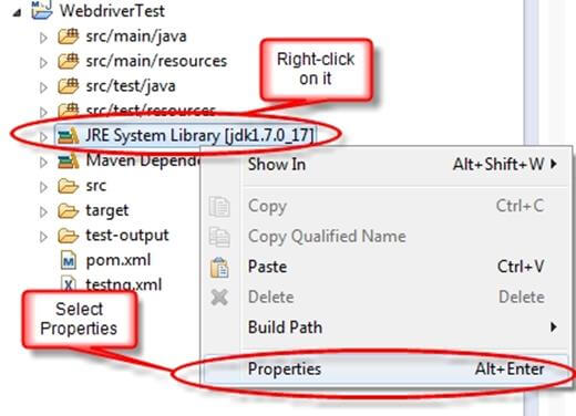 步骤 6) 右键单击 JRE System Library,然后从菜单中选择 Properties 选项。