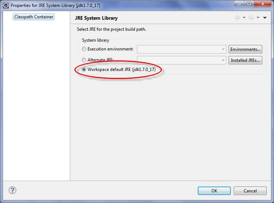 在 Properties for JRE System Library 对话框中,确保选择了 Workspace default JRE,然后单击 OK