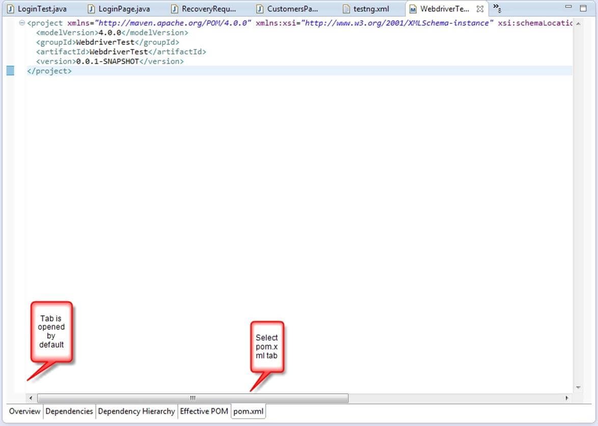 步骤 8) 在 <project> 节点中将 Selenium、Maven、TestNG、Junit 依赖项添加到 pom.xml