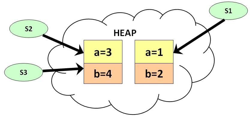 步骤6)如下图所示,s2变为null,但s3仍然指向该对象,并且不符合Java垃圾回收的条件。