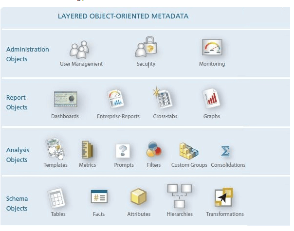 在 MicroStrategy 中,对象出现在系统层,供多个项目使用。它包括配置对象,如计划、数据仓库和登录 ID。
