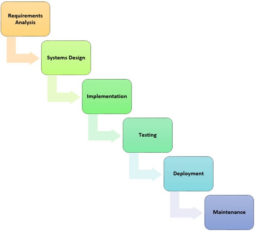 该瀑布模型使用顺序设计模型。只有在前一个阶段完成后,下一个阶段才能开始。第一个阶段通常绘制在顶部,后续阶段绘制在下方和左下方。这形成了一个瀑布状的结构,这也是它得名的原因。