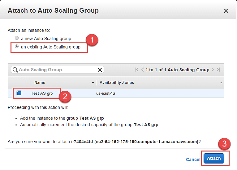 - 将实例附加到现有的 AS 组。您也可以在此步骤中创建一个新的 AS 组。