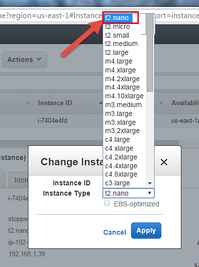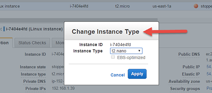 请注意,在 EC2 仪表板上,实例状态现在是“停止中”。您现在可以更改实例类型。