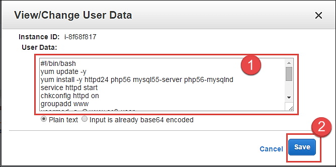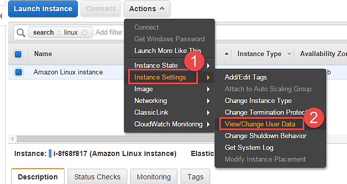 您必须先停止实例,如果实例正在运行,您将无法编辑实例的用户数据。在已停止的实例上,执行以下步骤。