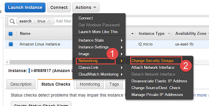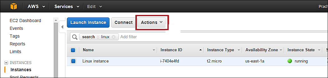 第 1 步) 在 EC2 仪表板上,选择您想修改配置参数的实例,然后点击“操作”按钮,如下图所示。