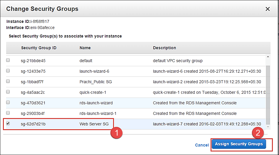 第 2 步) 在“更改安全组”向导中,它将显示实例上已有的 SG 以及区域中所有安全组的列表。