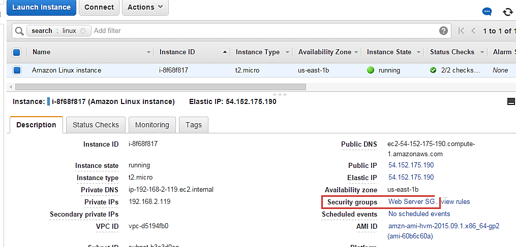 第 4 步) 在 EC2 仪表板上,您可以看到实例的 SG 已被更改。实例现在将根据新的 SG 设置发送/接收流量。