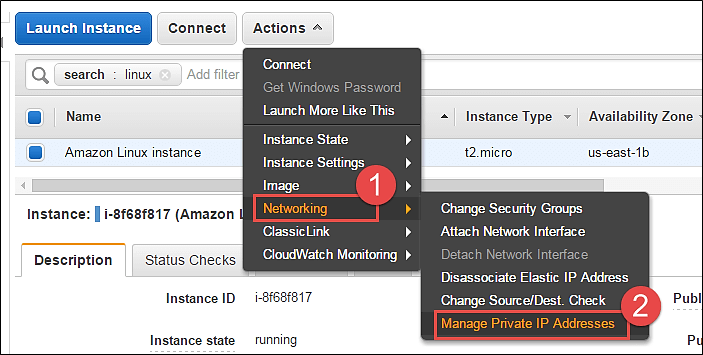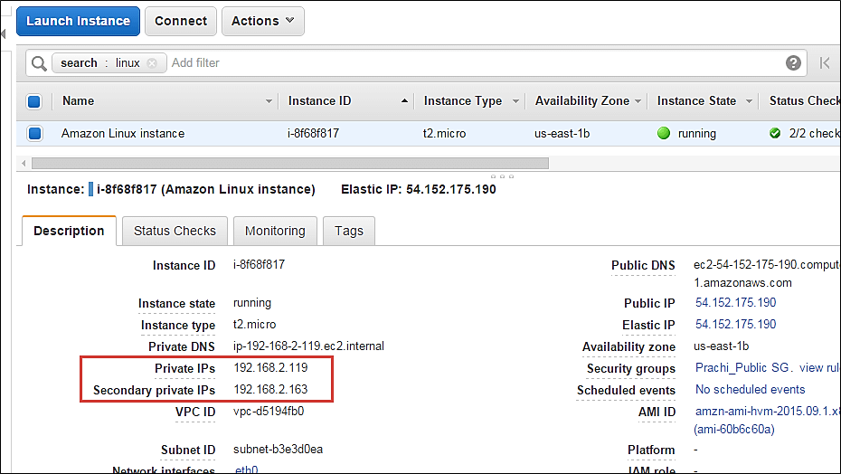 此外,返回 EC2 仪表板并注意分配的 2 个私有 IP。这些是单个网络接口上的 2 个 IP。