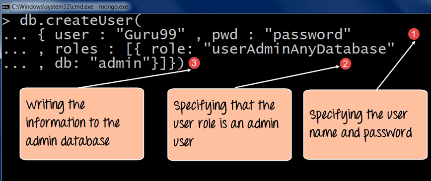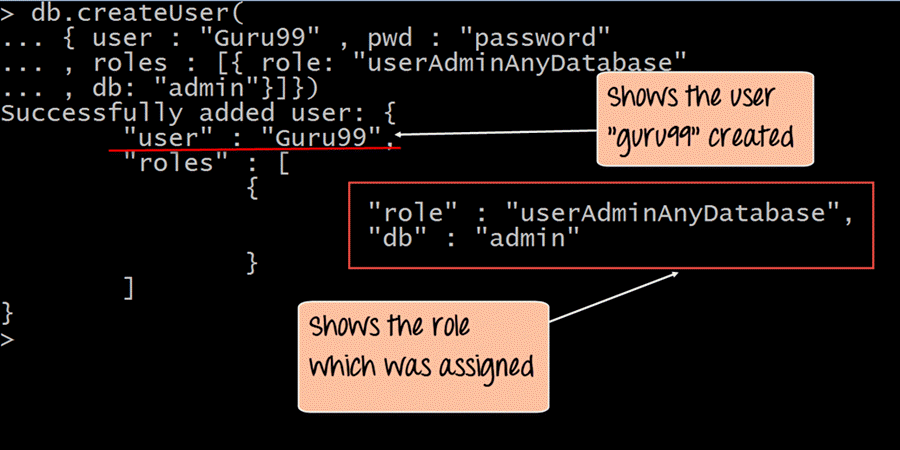 输出显示已创建名为“Guru99”的用户,并且该用户拥有 MongoDB 中所有数据库的权限。