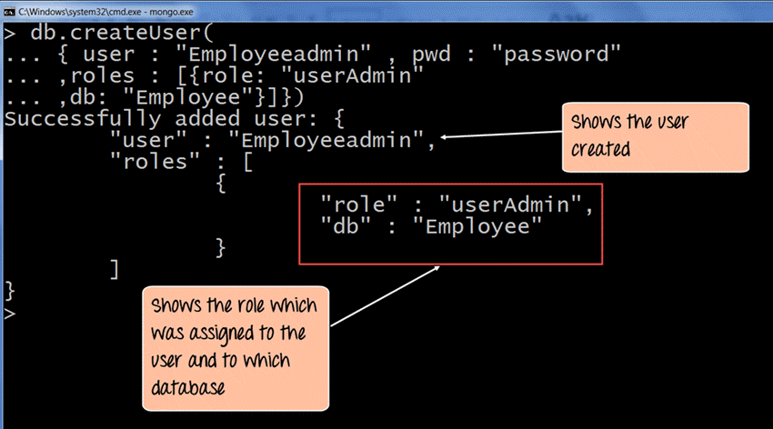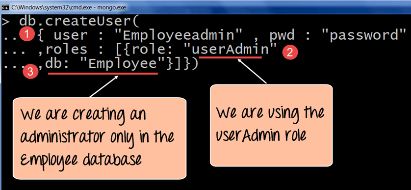 在 MongoDB 中创建用户管理员是通过使用 createUser 方法完成的。以下示例展示了如何实现这一点。