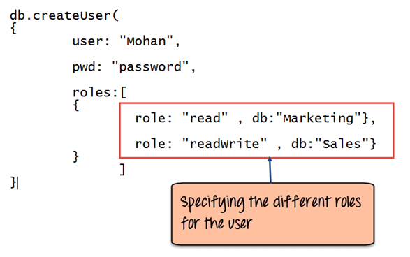 上面的代码片段显示已创建名为 Mohan 的用户,并为他在多个数据库中分配了多个角色。在上面的示例中,他被授予了对“Marketing”数据库的只读权限,以及对“Sales”数据库的读写权限。