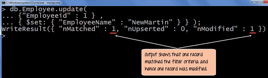 在此示例中,我们将首先查找 Employee id 为“1”的文档,并将 Employee 名称从“Martin”更改为“NewMartin”。