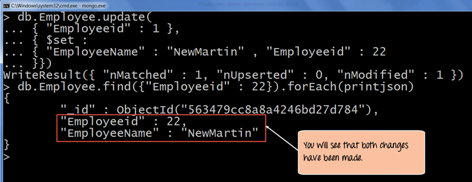 如果命令成功执行,并且您运行 **“find”** 命令搜索 Employee id 为 22 的文档,您将看到以下输出: