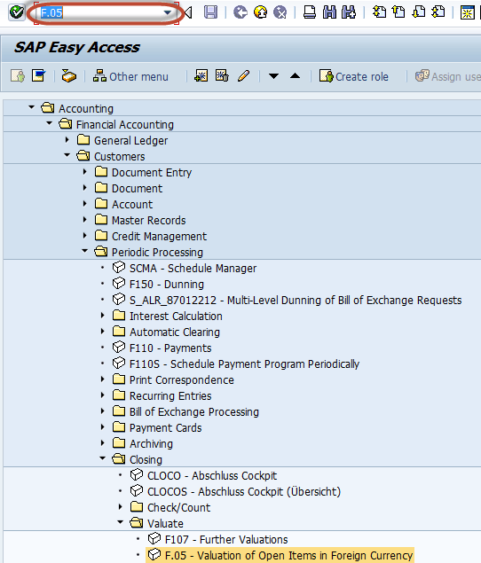 步骤 1) 在 SAP 命令字段中输入事务码 F.05