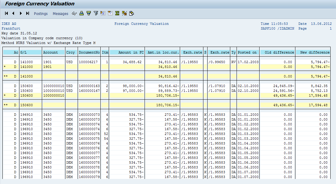 步骤 3) 在下一个屏幕中,将生成一份由报告 SAPF100 选定用于外币估值的总账科目列表。它评估以外币计价的未清项目以及外币资产负债表科目。