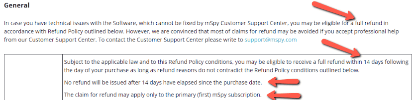 mSpy 在其条款中指出,如果您对服务不满意,您可以在此 14 天试用期内申请全额退款。