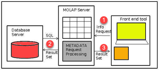 MOLAP 架构主要读取预编译的数据。MOLAP 架构在动态创建聚合或计算未预先计算和存储的结果方面能力有限。