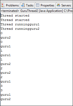 因此,首先,我们得到 guru1,然后是 guru2,然后又回到 guru2,因为线程在这里休眠 1000 毫秒,然后下一个 guru1,又回到 guru1,线程休眠 1000 毫秒,所以我们得到 guru2,然后是 guru1。
