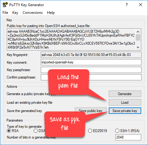 在您的Windows机器上,使用PuTTY生成器工具将pem文件转换为ppk