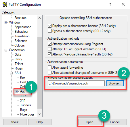 在“身份验证”部分,输入ppk密钥并点击“打开”