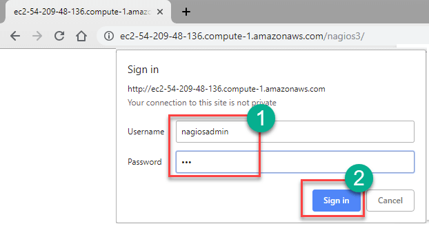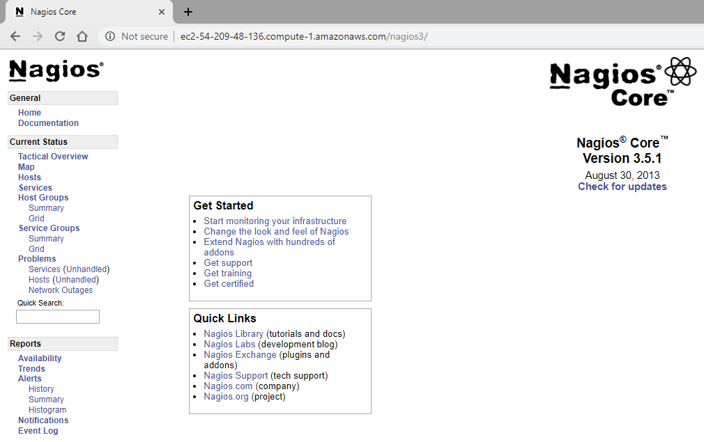 在您的浏览器中,访问http://<Public DNS>/nagios3,在本例中是http://ec2-54-209-48-136.compute-1.amazonaws.com/nagios3/