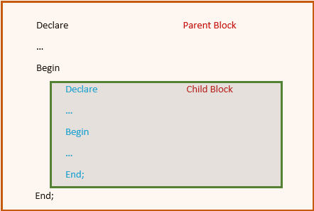 <<outer_block>> DECLARE <Declarative section> BEGIN <Execution part for outer block begins> <<inner block>> DECLARE <Declarative section> BEGIN <Execution part for inner block>. EXCEPTION <Exception handling part> END; <Execution part for outer block begins> EXCEPTION <Exception handling part> END;