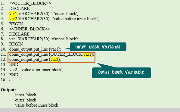 <<OUTER_BLOC>> DECLARE ln_val NUMBER :=5; BEGIN <<INNERBLOC>> DECLARE ln_val NUMBER :=3; BEGIN dbms_output.put_line(The difference between outer block and inner block variable is:'||' outer_block. ln_val-inner_block.ln_val); END; END; /