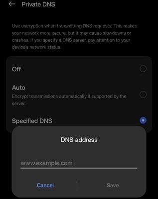 第 3 步)点击“指定 DNS”并输入新的 DNS 地址
