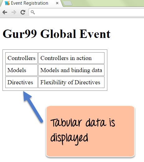 下面的代码片段假定存在一个名为“tutorial”的作用域变量。然后它使用 ng-repeat 指令,该指令遍历“Tutorial”变量中的每个主题,并显示 ‘name’ 和 ‘description’ 键值对的值。