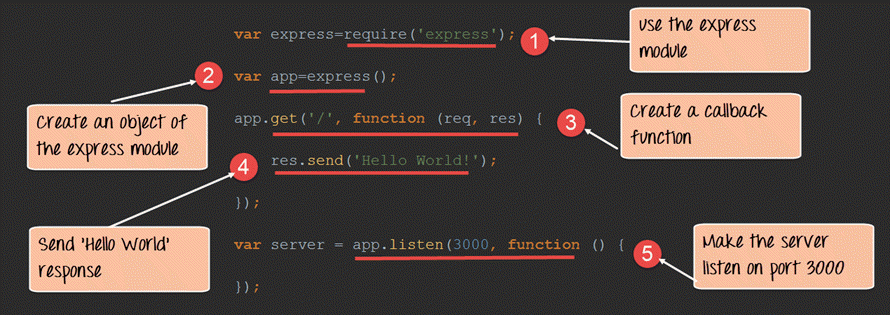 - 在我们代码的第一行,我们使用 `require` 函数来包含“express 模块”。