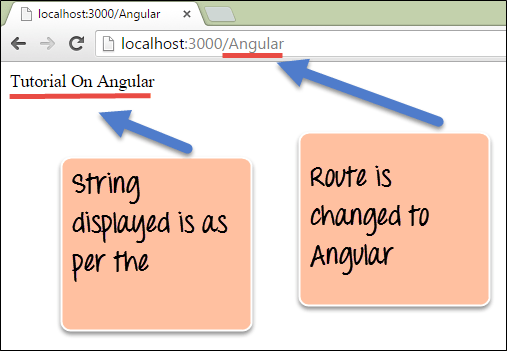 - 您可以看到,如果 URL 已更改为 `/Angular`,则会选择相应的 Node 路由,并显示字符串“Tutorial On Angular”。