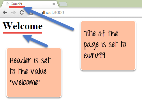 - 我们将“Guru99”和“Welcome”的值分别传递给“title”和“message”参数。这些值将被 index.jade 模板中声明的 `title` 和 `message` 参数替换。