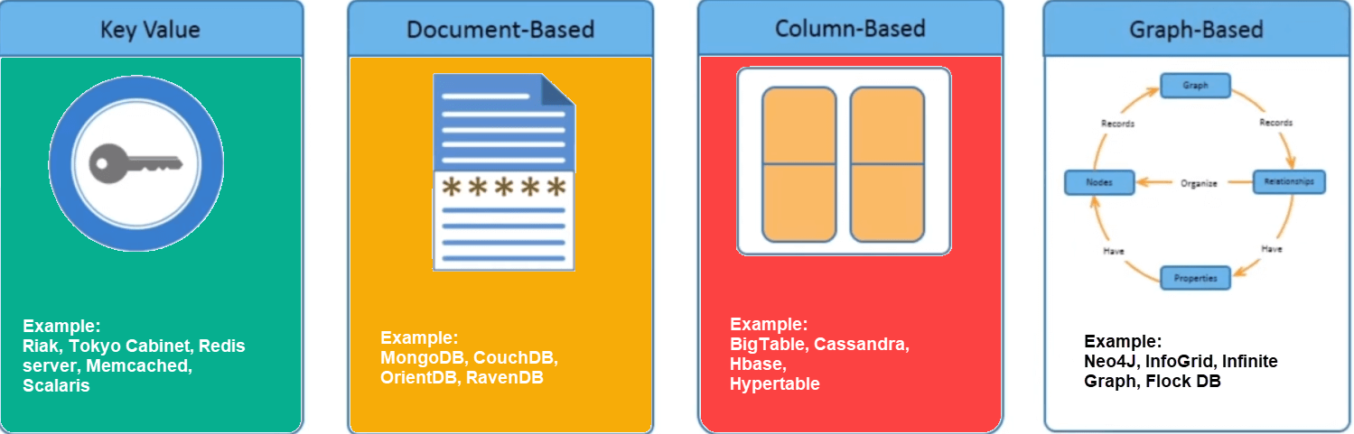 - NoSQL 数据库有四种类型:1)。键值对数据库 2)。面向列的图 3)。基于图 4)。面向文档