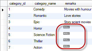 为了满足真正关系数据库管理系统的要求,MySQL 使用 NULL 作为未提交值的占位符。下面的屏幕截图显示了 NULL 值在数据库中的外观。