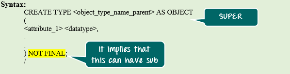 CREATE TYPE <object_type_name_parent> AS OBJECT ( <attribute_l><datatype>, . . )NOT FINAL; /