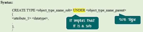 CREATE TYPE<object_type_name_sub>UNDER<object_type_name_parent> ( <attribute_l><datatype>, . ); /